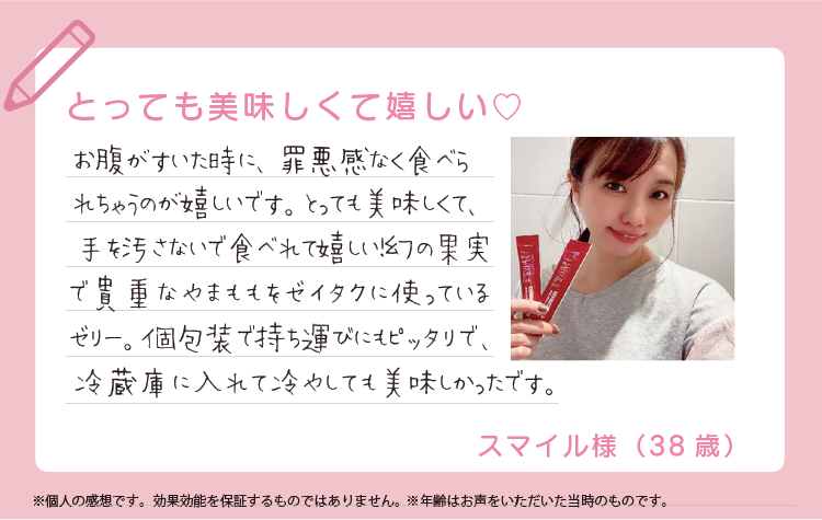 グラニュー糖(国内製造)、コラーゲンペプチド(ゼラチンを含む)、やまもも果汁、もも果汁/クエン酸、ゲル化剤(増粘多糖類)、香料